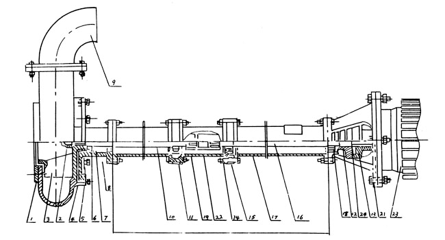 本泵系單級(jí)單吸立式離心泵,流體沿泵軸的軸線成70°方向流出,主要部件有蝸殼、葉輪、泵座、泵殼、支撐筒、電機(jī)座、電動(dòng)機(jī)等。蝸殼、泵座、電機(jī)座、葉輪螺母是生鐵鑄造,耐磨性、耐腐蝕性較好,加工工藝方便。 葉輪為三片單圓弦彎葉,選用半封閉葉輪,并采用可鍛鑄鐵所以強(qiáng)度高,耐腐蝕;加工方便,通過(guò)性好,效率高。 為了減輕重量和少車(chē)削量,泵軸是優(yōu)質(zhì)碳素鋼冷拉圓鋼制造。 泵座中裝有四只骨架油封和軸套,防止軸磨損,延長(zhǎng)軸的使用壽命。 本泵可垂直或傾斜使用,占地面積小,蝸殼需埋在工作介質(zhì)中工作,容易啟動(dòng),不需引水,旋轉(zhuǎn)方向應(yīng)從電機(jī)尾部看是順時(shí)針?lè)较蚬ぷ鳌?總機(jī)長(zhǎng)度備有各種規(guī)格,以便使用單位根據(jù)用途因地制宜地選用。